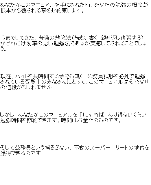 しかし、この「記憶術、速読術」を使う事で、過去問題集(新スーパー過去問ゼミ)を一冊を 覚えるのに3ヶ月掛かってた私が3日で一冊覚えられるようになりました。